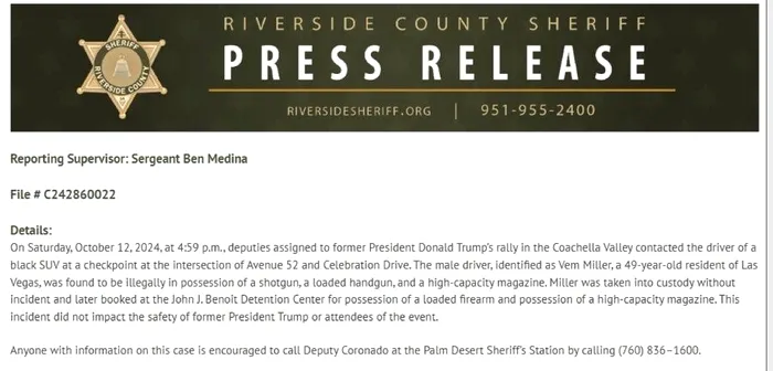 Bărbatul, care avea asupra sa o pușcă, o armă semiautomată și „un încărcător de mare capacitate”, a fost arestat la o intersecție din apropierea locului în care urma să se desfășoare mitingul lui Donald Trump din Coachella, California.