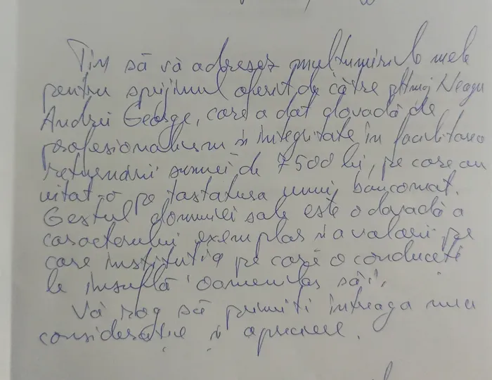 „Bărbatul care uitase banii a fost găsit şi şi-a recuperat întreaga sumă, în condiţii de siguranţă. Ulterior, acesta a transmis o scrisoare de mulţumire Jandarmeriei Tulcea, apreciind profesionalismul şi corectitudinea jandarmului care a dat dovadă de responsabilitate, implicare şi integritate”.