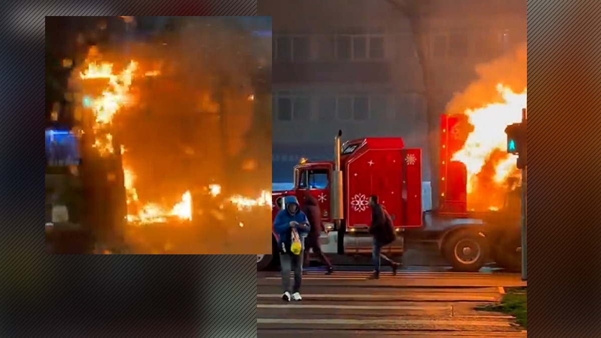 Imaginile cu camionul Coca-Cola în flăcări au fost surprinse de şoferii aflați în trafic şi postate de reţelele sociale.