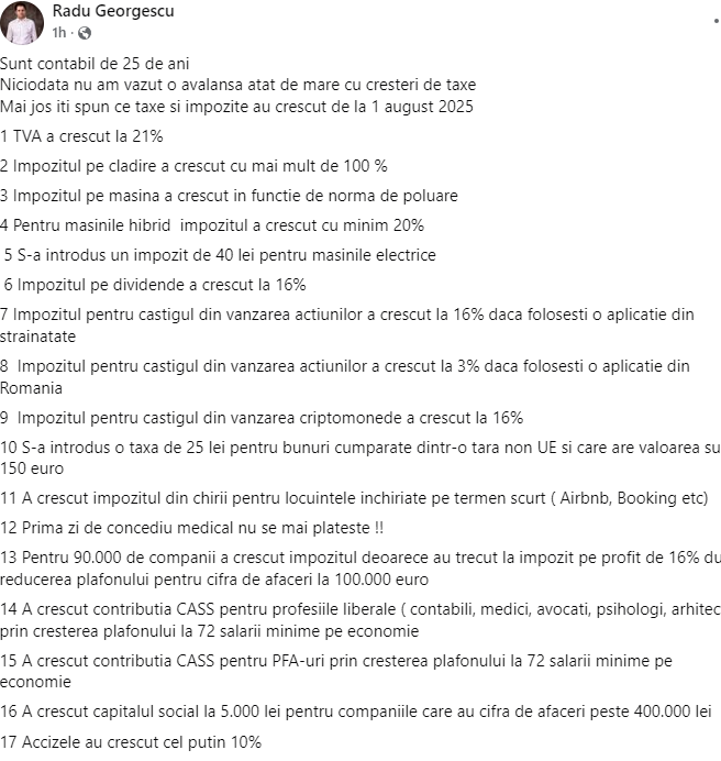 Radu Georgescu face un inventar sumar, dar elocvent al principalelor creșteri de taxe și impozite. După cum se poate vedea mai jos, lista este foarte lungă, iar în 2026 ea ar putea crește, așa cum a avertizat deja premierul Bolojan.