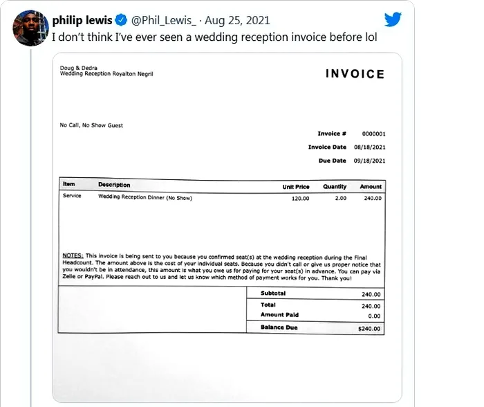 Doug și Deidra Simmons s-au confruntat cu critici după ce au postat o factură adresată oaspeților care nu au participat la nuntă pe rețelele de socializare.
