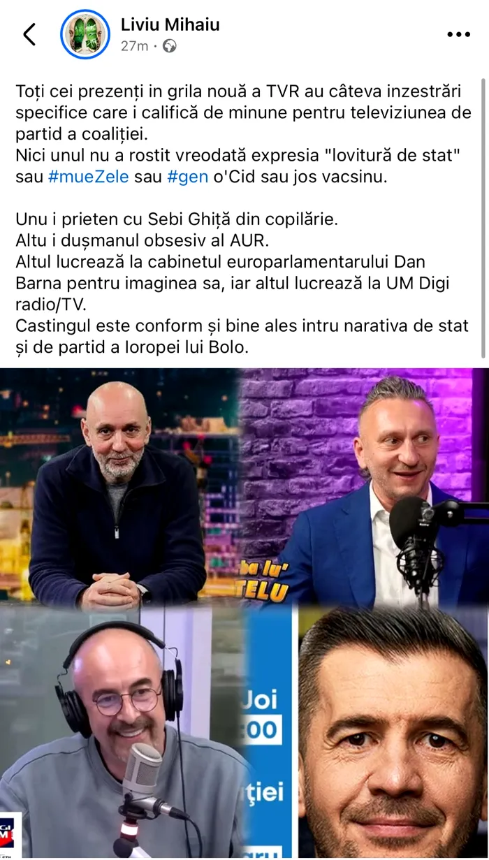În mesajul publicat online, Liviu Mihaiu susține că persoanele incluse în noua grilă ar avea „profiluri compatibile” cu ceea ce el numește „televiziunea de partid a coaliției”.