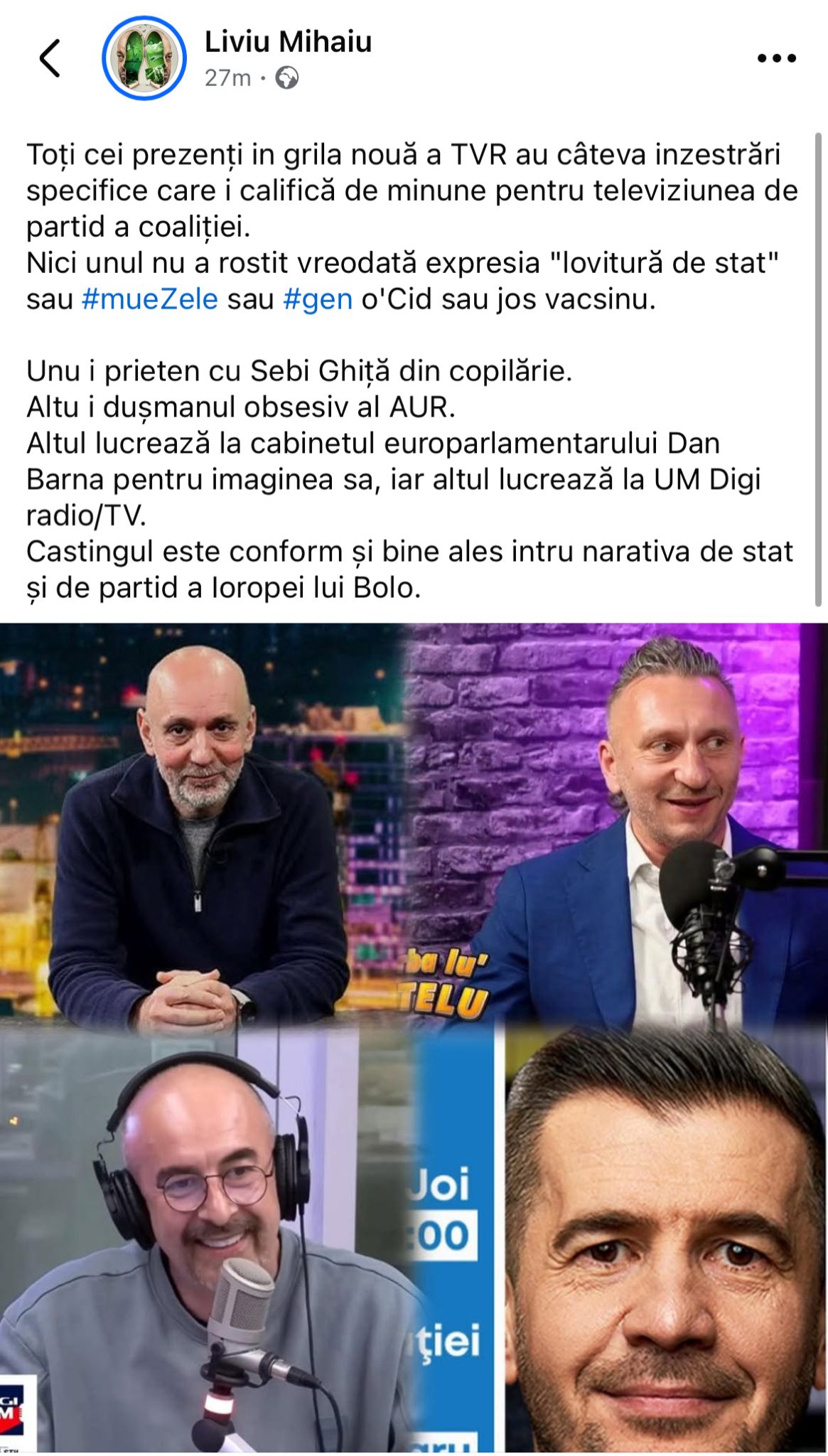 „Unu i prieten cu Sebi Ghiță din copilărie. Altu i dușmanul obsesiv al AUR. Altul lucrează la cabinetul europarlamentarului Dan Barna pentru imaginea sa, iar altul lucrează la UM Digi radio/TV. Castingul este conform și bine ales intru narativa de stat și de partid a Ioropei lui Bolo”, a încheiat fostul realizator TVR.