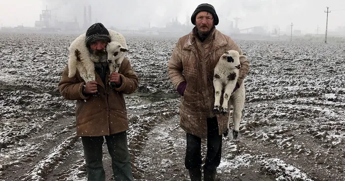 Dintre miile de imagini care au fost surprinse cu un iPhone şi înscrise în competiţie, fotografia fotojurnalistului Istvan Kerekes, realizată în Târgu Mureş, scoate în evidenţă contrastul dintre pământul îngheţat şi lipsit de viaţă şi doi păstori transilvăneni, care ţin fiecare câte un miel.