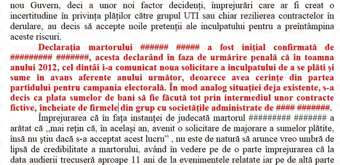 Conform motivării, anumiți martori aveau cunoștință de faptul că o parte din bani era destinată „cerințelor din partea partidului pentru campania electorală”. Astfel, mita, inițial colectată pentru influențarea deciziilor ministeriale, a fost redirecționată către activități politice, implicând folosirea contractelor fictive pentru a masca sumele, mai transmite în exclusivitate sursa citată.
