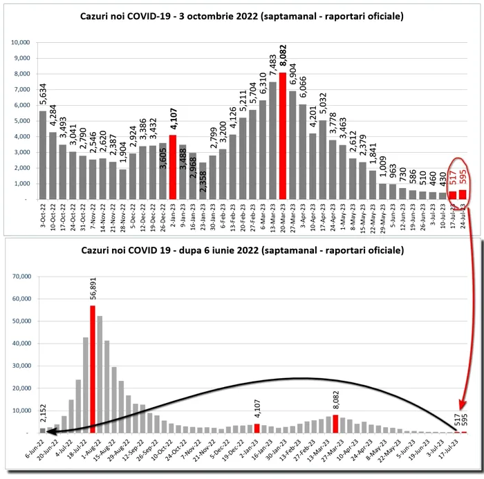 ”Am înregistrat a doua săptămână de creștere consecutivă a numărului de cazuri noi de COVID-19. Avem astfel confirmarea că a debutat și în România al doilea val endemic din acest an. Am adăugat și un grafic care surprinde ultimul val epidemic (Valul 6 – BA.5) din vara anului trecut, al cărui vârf a atins aproape 57.000 de cazuri săptămânale.