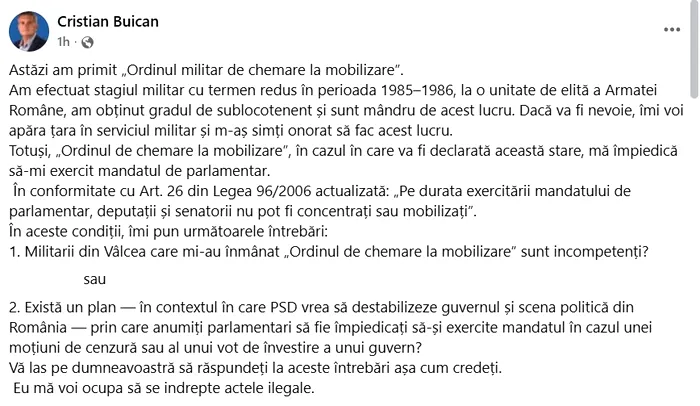 Cea mai nouă teorie a conspirației: parlamentarii PNL sunt chemați de Armată la mobilizare ca să nu poată vota moțiunea de cenzură împotriva guvernului Bolojan sau o eventuală învestire a unui nou guvern. Un parlamentar din PNL scrie, pe Facebook, că a fost convocat la unitatea militară de care aparține printr-un ordin. Mai mult, susține el, ar fi fost chemat ca să nu poată vota o eventuală moțiune de cenzură, acesta fiind unul dintre scenariile pe care le avansează. Este vorba de parlamentarul PNL Cristian Buican.