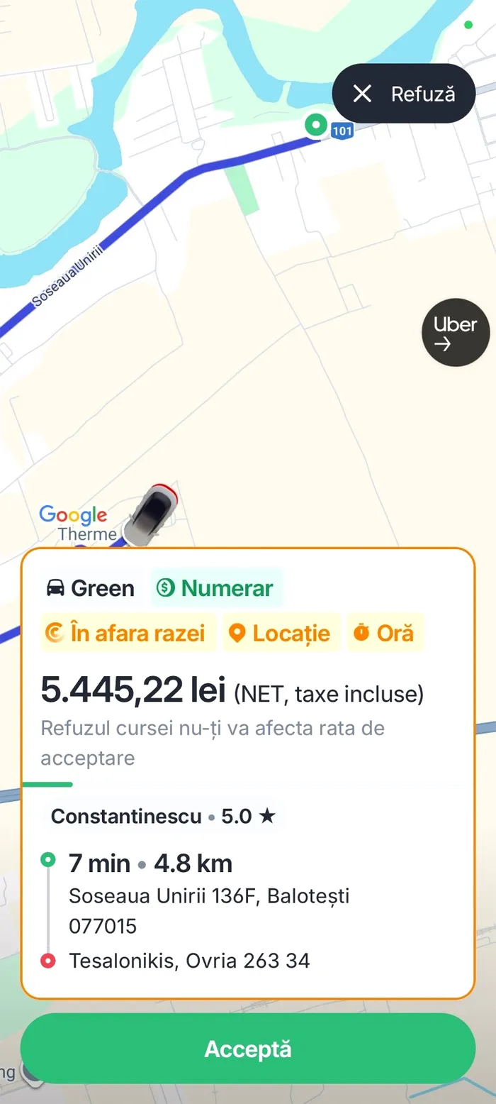 Un român a comandat un Uber până în Grecia. Acesta a pus punctul de preluare al cursei din Balotești, Șoseaua Unirii 136F, până în Salonic, Grecia.