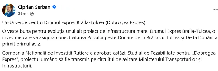 Ministrul Transporturilor, Ciprian Șerban, informează că s-a dat undă verde pentru demararea construcției Dobrogea Expres, mai precis Drumul Expres Brăila-Tulcea. Dobrogea Expres va asigura conexiunea la standarde europene către Delta Dunării, un obiectiv turistic unic în Europa, lipsit până acum de o infrastructură rutieră adecvată.