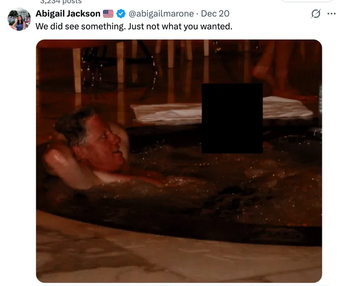 Între timp, echipa de presă a Casei Albe a subliniat acest aspect. „Am văzut ceva”, a scris Abigail Jackson, purtătoare de cuvânt a lui Trump, pe X , deasupra fotografiei cu Clinton într-o cadă cu hidromasaj: „Pur și simplu nu este ceea ce v-ați dorit.”