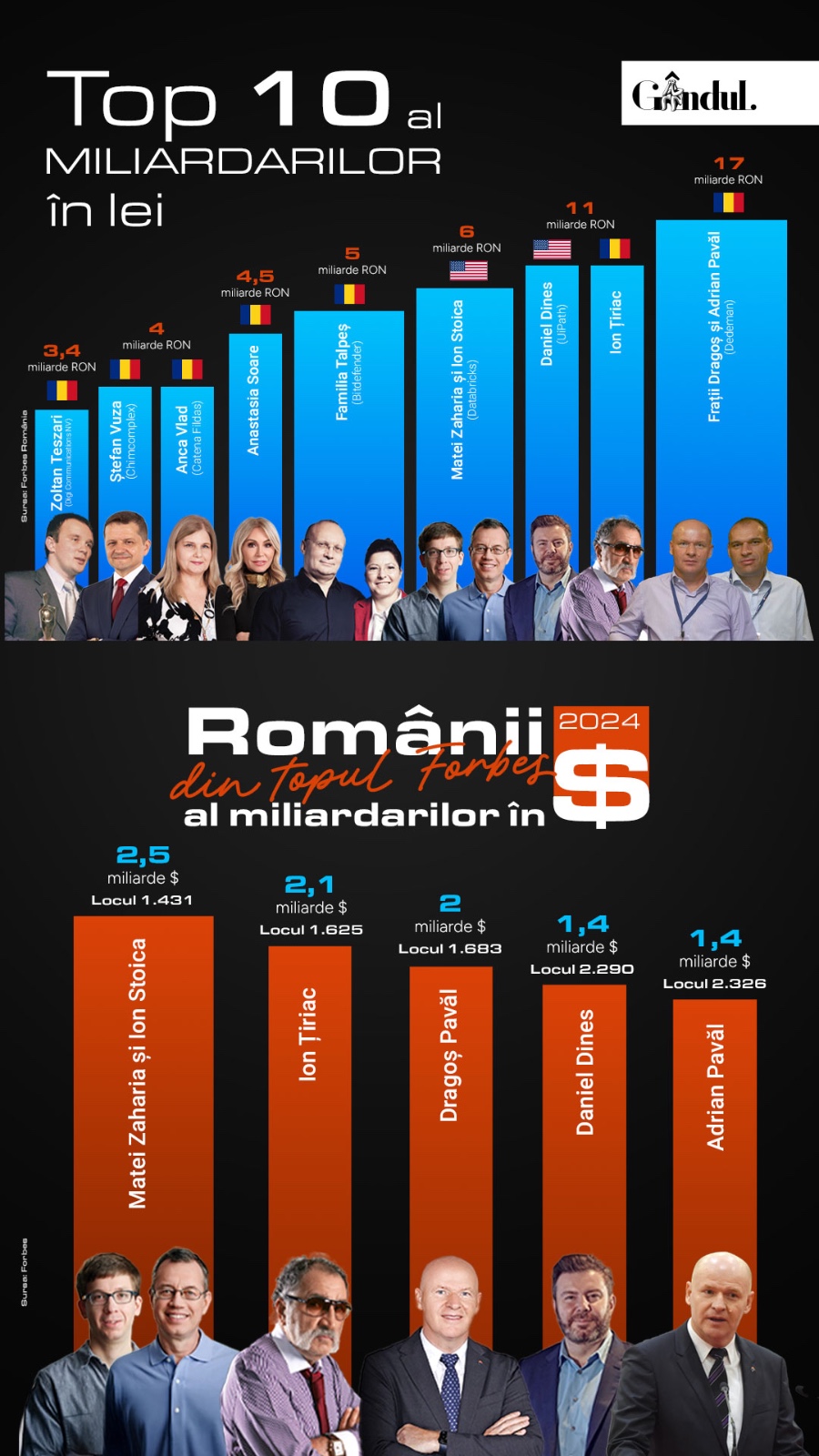 În Topul Forbes al celor mai bogați 10 români în 2024, publicat la sfârșitul lunii noiembrie, sunt și miliardari care s-au stabilit în afara țării. Șase dintre cei 10 sunt în topul global al miliardarilor în dolari, care se actualizează zilnic.