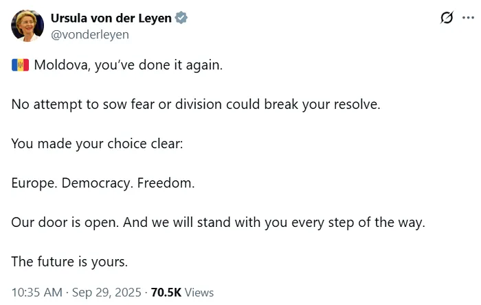 „Moldova, ai reușit din nou. Nicio încercare de a semăna frică sau dezbinare nu ți-ar putea zdruncina hotărârea. Ți-ai făcut o alegere clară: Europa. Democrație. Libertate. Ușa noastră este deschisă. Și vom fi alături de tine la fiecare pas. Viitorul este al tău”, a scris Ursula von der Leyen pe platforma X.