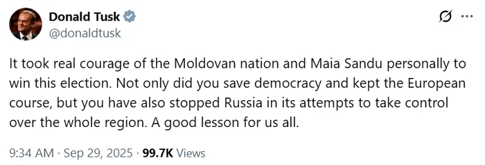 „A fost nevoie de un adevărat curaj din partea națiunii moldovenești și a Maiei Sandu personal pentru a câștiga aceste alegeri. Nu numai că ați salvat democrația și ați menținut cursul european, dar ați și oprit Rusia în încercările sale de a prelua controlul asupra întregii regiuni. O lecție bună pentru noi toți”, a scris Donald Tusk pe X.