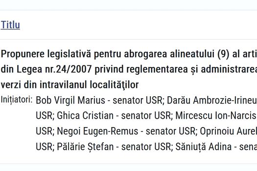 „Terenurile înscrise în cartea funciară ca fiind în categoria curți-construcții, terenuri ce se află în proprietatea privată a persoanelor fizice sau juridice, nu pot fi inventariate sau declarate ca spații verzi, în sensul legii, decât după îndeplinirea procedurii de expropriere conform legislației în domeniu”. Acesta este alineatul 9 al articolului 18 din Legea 24/2007 „privind reglementarea și administrarea spațiilor verzi din intravilanul localităților”, pe care deputații USR vor să-l abroge.