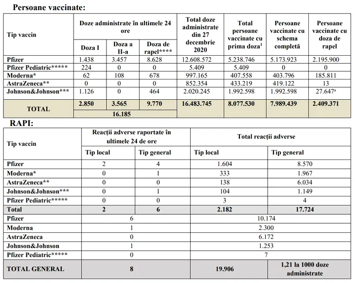 În ultimele 24 de ore s-au înregistrat 8 reacții adverse, 6 la Pfizer, 1 la Moderna și 1 la Johnson&Johnson. De la debutul campaniei de vaccinare, numărul total al reacțiilor adverse a fost de 19.906 (1,21/1000 doze administrate).