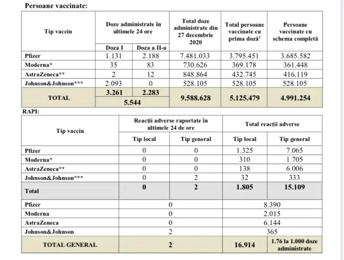 În ultimele 24 de ore s-au înregistrat 2 reacții adverse, iar 56 sunt în curs de investigare. De la debutul campaniei de vaccinare, numărul total al reacțiilor adverse a fost de 16.914.