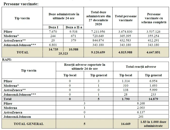 CNCAV mai arată că din cele 9.985 de prime doze, 3.863 au fost vaccinuri Johnson&Johnson care se administrează în doză unică. De la începutul campaniei de vaccinare, din 27 decembrie 2020 și până acum au fost administrate 9.129.223 de doze unui număr de 4.820.743de persoane, dintre care 4.653.572 au primit schema completă.
