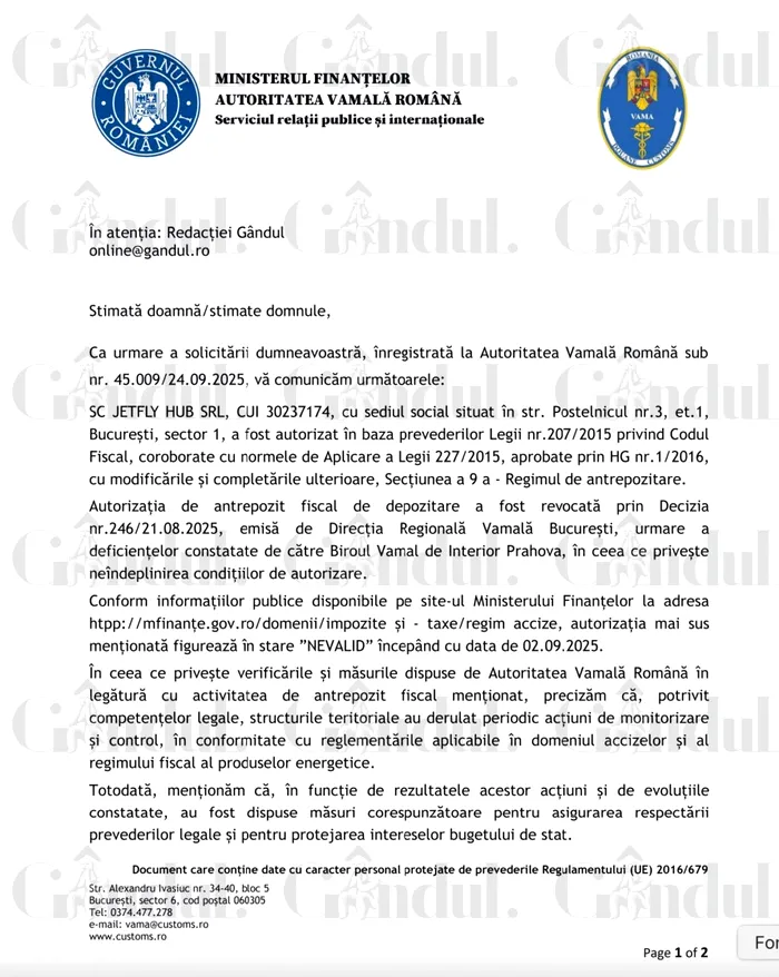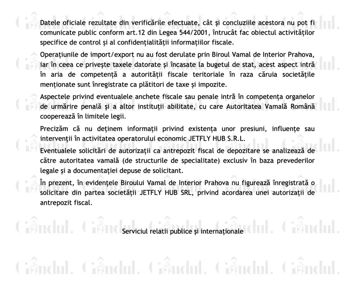 ”Eventualele solicitări de autorizații ca antrepozit fiscal de depozitare se analizează de către autoritatea vamală (de structurile de specialitate) exclusiv în baza prevederilor legale și a documentației depuse de solicitant. În prezent, în evidențele Biroului Vamal de Interior Prahova nu figurează înregistrată o solicitare din partea societății JETFLY HUB SRL, privind acordarea unei autorizații de antrepozit fiscal”, mai precizează Autoritatea Vamală Română la solicitarea Gândul.