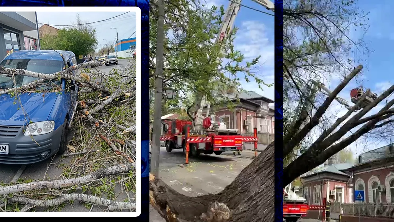 Vântul a făcut RAVAGII în București: Mai mulți copaci au căzut peste mașini / Panouri publicitare și elemente de construcție, luate pe sus