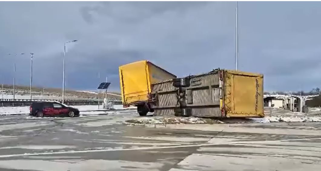 „A1, sectorul Sibiu – Boița! Remorca unui autocamion a fost răsturnată de vânt în timp ce staționa în parcarea din zona Tălmaciu.
