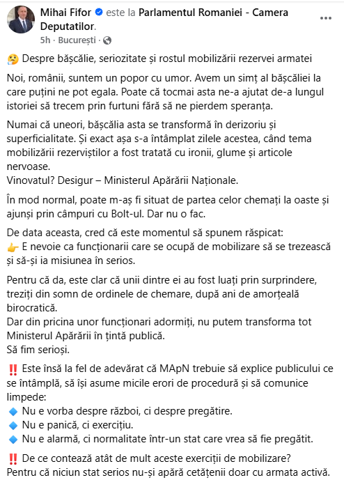 Deputatul PSD, Mihai Fifor, îi ceartă pe cei care iau în râs acțiunea de mobilizare inițiată de Ionuț Moșteanu și crede că unicul vinovat pentru acest val de glume nu e nimeni altul decât Ministerul Apărării Naționale. Fostul ministru MApN consideră că este necesar ca astfel de mobilizări să aibă loc, iar cei de la MApN ar trebui „să explice publicului ce se întâmplă, să își asume micile erori de procedură și să comunice limpede: nu e vorba despre război, ci despre pregătire.”