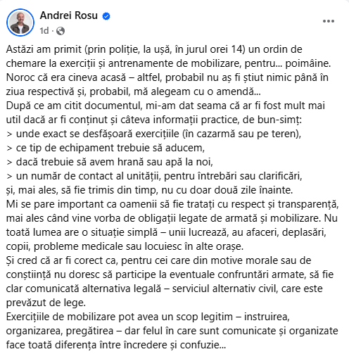 Și fostul solist al trupei „Gaz pe foc”, a primit ordinul de la MApN și a reacționat într-o postare rapidă. Acesta spune că nu chemarea în sine l-a deranjat, ci lipsa de informații din documentul primit de la Ministerul Apărării. „După ce am citit documentul, mi-am dat seama că ar fi fost mult mai util dacă ar fi conținut și câteva informații practice, de bun-simț” a spus Andrei Roșu.