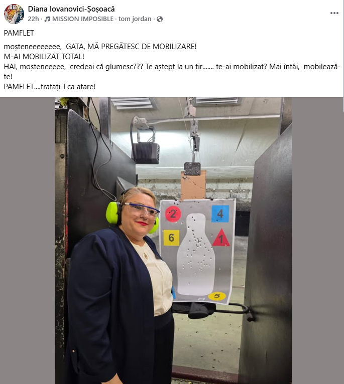 Bineînțeles că exercițiul de la MApN nu o putea lăsa indiferentă pe Diana Șoșoacă. Imediat cum a aflat, Lidera SOS i-a lansat o invitație ministrului Moșteanu pe pagina de Facebook. Invitația, ironică, desigur, era pentru o partidă de tragere într-un poligon.