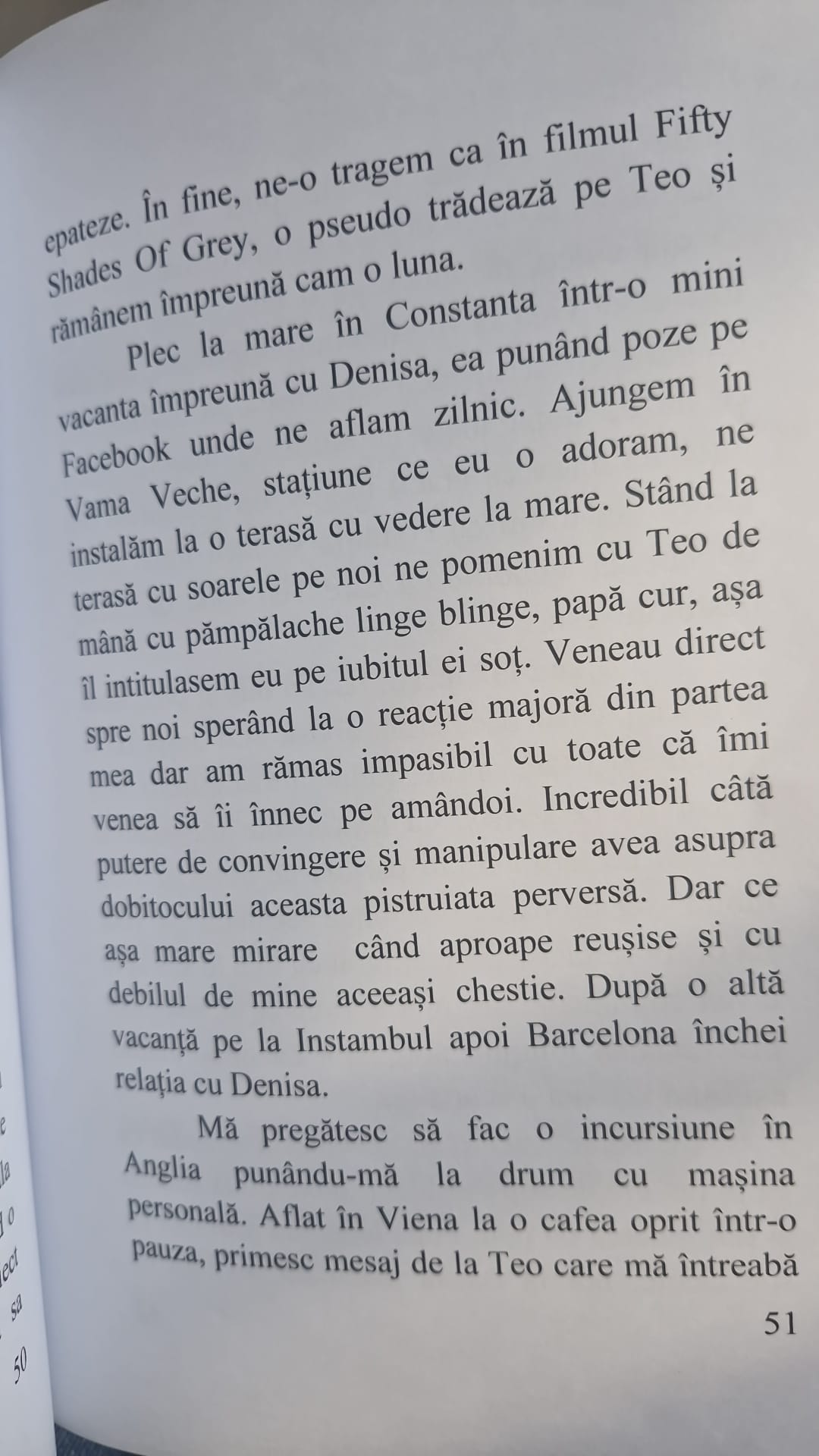 În fine, ne-o tragem ca în filmul Fifty Shades Of Grey, o pseudo trădează pe Teo și rămânem împreună cam o lună. Plec la mare împreună cu Denisa, ea punând poze pe Facebook unde ne aflam zilnic…