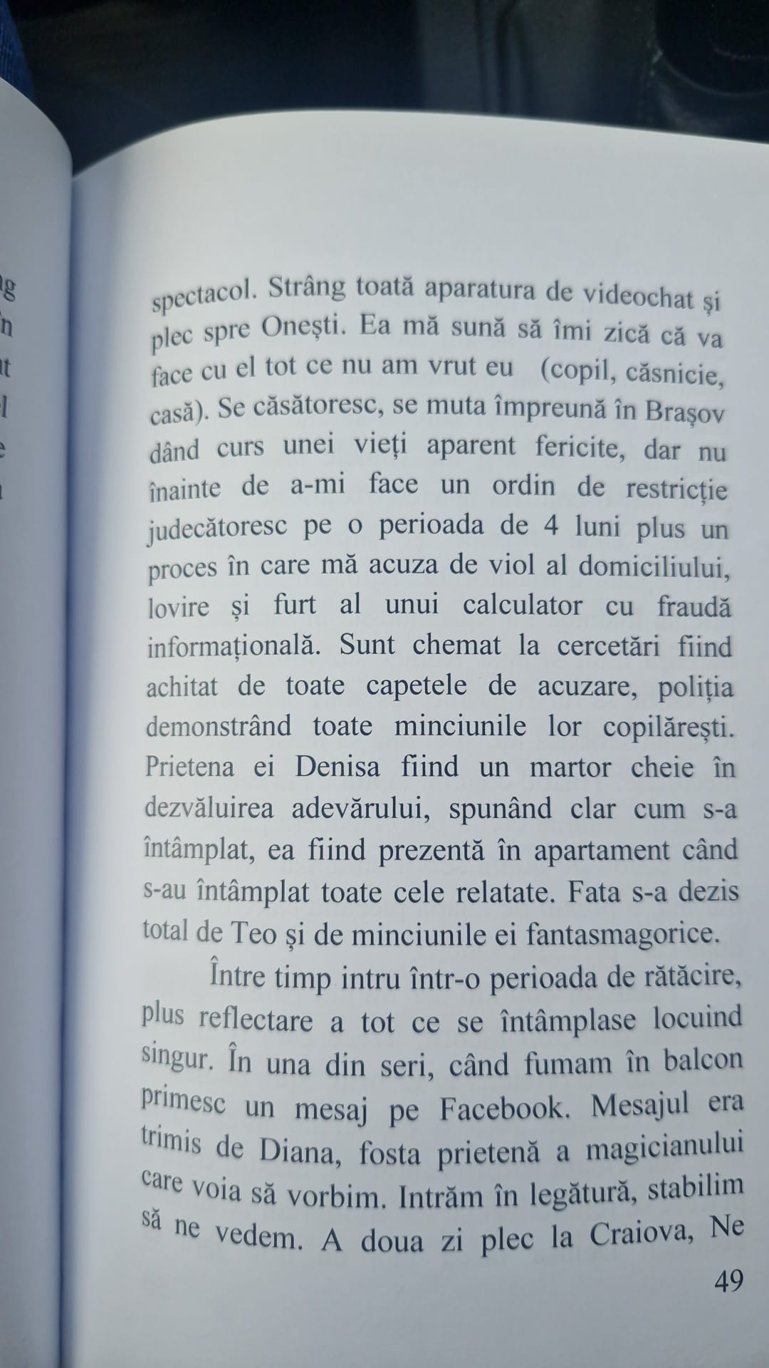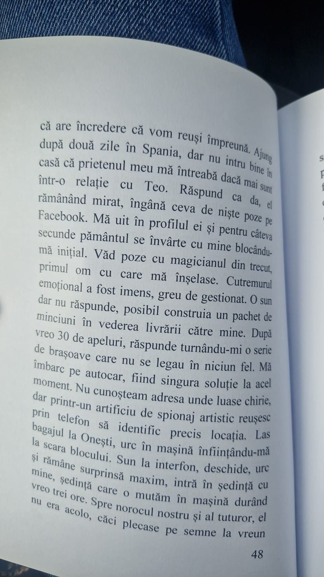 Văd poze cu magicianul din trecut, primul om cu care mă înșelase. Cutremurul emoțional a fost imens, greu de gestionat. O sun, dar nu răspunde. Posibil construia un pachet de minciuni în vederea livrării către mine. După vreo treizeci de apeluri, răspunde turnându-mi o serie de brașoave, care nu se legau de nici un fel…