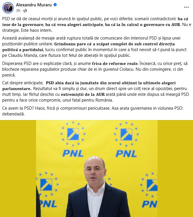 Printr-o postare pe Facebook, Alexandru Muraru a acuzat PSD de lipsă de coerență și de lansarea unor scenarii contradictorii în spațiul public, de la ieșirea de la guvernare până la posibile alianțe cu AUR.