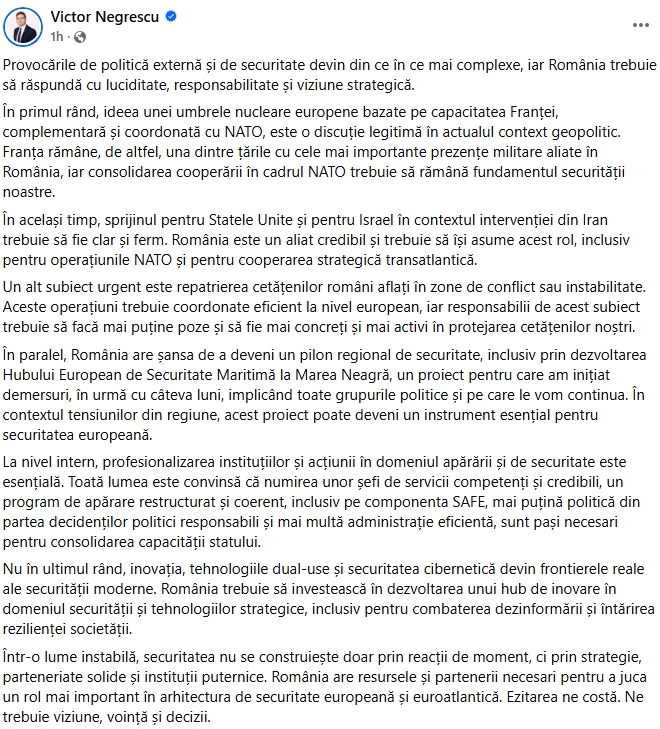 Printr-o postare pe pagina sa de Facebook, Victor Negrescu a solicitat o viziune strategică mai clară în politica de securitate a României. Europarlamentarul PSD a numit extinderea umbrelei nucleare franceze drept o „discuție legitimă” și a pledat pentru un sprijin „ferm și clar” pentru Statele Unite și Iran, relatează Mediafax.