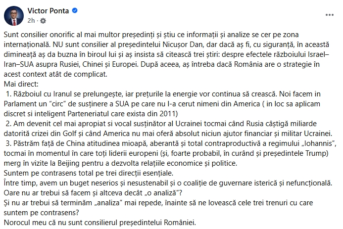 Printr-o postare pe pagina sa de Facebook, Victor Ponta a transmis că, dacă ar fi consilierul președintelui Nicușor Dan, i-ar sugerea șefului statului să se informeze cu privire la efectele războiului Israel–Iran–SUA asupra Rusiei, Chinei și Europei, după care l-ar întreba pe acesta ce strategie are România într-un asemenea context complicat.