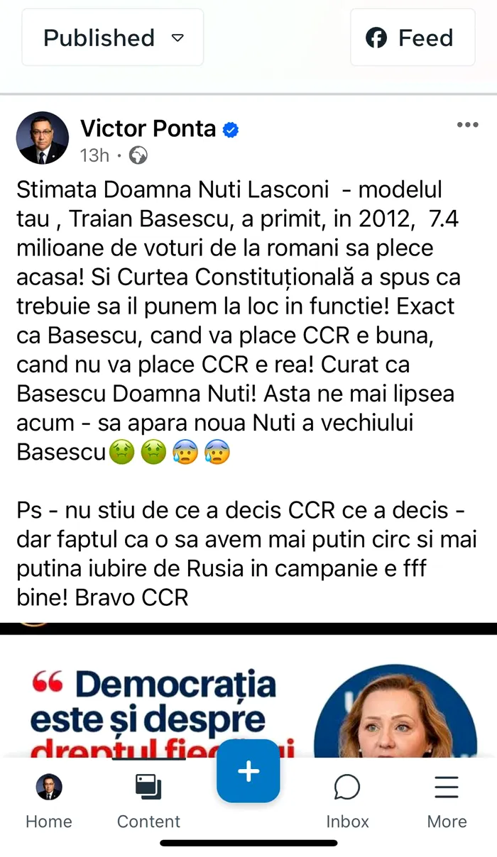 Stimată Doamnă Nuți Lasconi – modelul tău, Traian Băsescu, a primit, în 2012, 7.4 milioane de voturi de la români, să plece acasă! Și Curtea Constituțională a spus că trebuie să îl punem la loc în funcție! Exact ca Băsescu, când vă place, CCR e bună, când nu vă place CCR, e rea! Curat ca Băsescu, Doamna Nuți! Asta ne mai lipsea acum – să apară noua Nuți a vechiului Băsescu! Ps – nu știu de ce a decis CCR ce a decis – dar faptul că o să avem mai puțin circ și mai puțină iubire de Rusia, în campanie, e fff bine! Bravo CCR!, a transmis Victor Ponta.