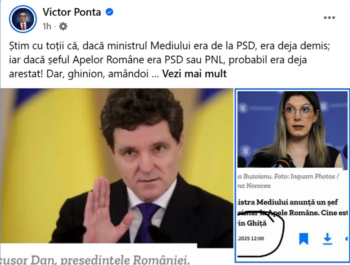 „Știm cu toții că, dacă ministrul Mediului era de la PSD, era deja demis; iar dacă șeful Apelor Române era PSD sau PNL, probabil era deja arestat! Dar, ghinion, amândoi sunt de la USR – asa ca pe langa apa murdara ne inecam si cu minciunile Propagandei Useriste! Ne-am întors rapid la „Epoca Iohannis”.