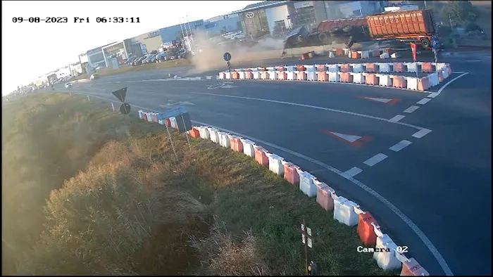În imagini, se observă momentul exact în care un TIR intră cu viteză în sensul giratoriu, lovește 2 mașini după care se răstoarnă.