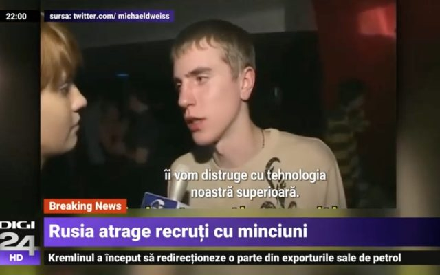 ”Dar cu cine luptă rușii? Știți că i-am tot descris pe soldații ăștia, pe recruții ăștia pe care i-a trimis Putin în Ucraina, unii nici măcar nu știau cum arată un glonț, dar să ducă un război, și știți isprăvile lor. Operațiunea continuă, armata rusă are în continuare nevoie de recruți, are în continuare nevoie de soldați și pe unii dintre ei, ce credeți, l-a filmat o televiziune din Rusia. Iată-l”, a făcut prezentarea moderatorul tv, potrivit g4media.ro.