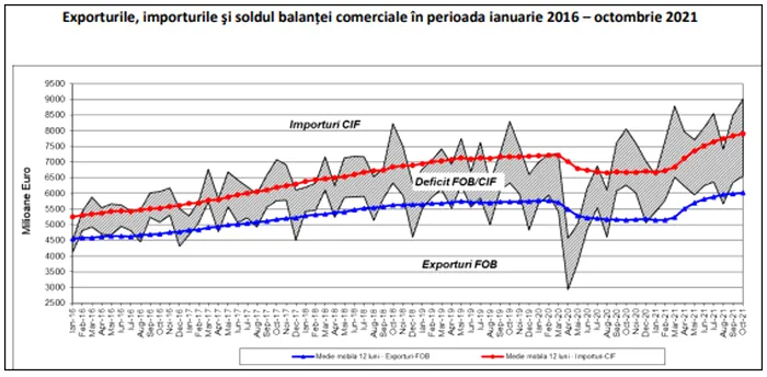 Ca urmare, deficitul balanţei comerciale (FOB/CIF) în perioada 1 ianuarie – 31 octombrie 2021 a fost de 19,2 miliarde de euro, mai mare cu 4,35 miliarde de euro decât cel înregistrat în primele zece luni din 2020.