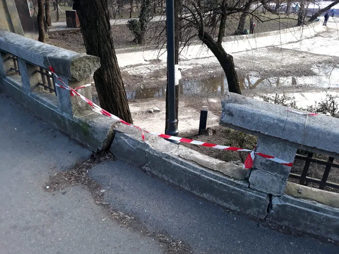 Podul Mare din Cișmigiu este într-o stare deplorabilă, iar în toamna anului trecut, o bucată mare din balustradă s-a prăbușit. De atunci, piatra a rămas tot acolo, în grădina de lângă pod, fix în locul în care a căzut.