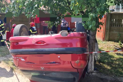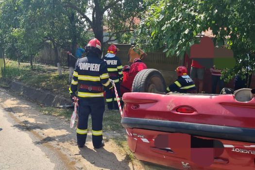 Mașina a rămas suspendată pe capotă. Două persoane au fost rănite, pentru o victimă fiind necesară intervenția elicopterului SMURD.