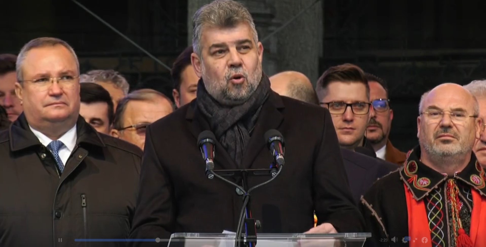 “Când am fost uniţi cu toţii, popor şi conducători, am făcut Mica Unire. Când am fost uniţi, am făcut România Mare. Când am fost uniţi, am scăpat de dictatură. Toţi împreună, uniţi, am reuşit să ne găsim aliaţi de nădejde pentru a apăra securitatea ţării odată cu aderarea la NATO şi la Uniunea Europeană. Unitatea este soluţia. Tot uniţi să intrăm în spaţiul Schengen, tot uniţi, să dezvoltăm economic toate regiunile ţării, împreună, urmărind aceleaşi obiective. Tot uniţi să continuăm ceea ce am făcut în ultimul an, la propriu, nu pe hârtie, unirea tuturor regiunilorţării prin autostrăzi, pentru că doar împreună cu aceleaşi obiective putem continua să atragem mai multe fonduri europene. Tot împreună putem creşte economia românească. Vă îndemn, aşadar, să lăsăm deoparte tot ce ne desparte şi uniţi să ne urmărim cu perseverenţă obiectivele comune creşterea economică şi creşterea nivelului de trai al românilor. La mulţi ani, România! La mulţi ani, români!”, a mai declarat Ciolacu.