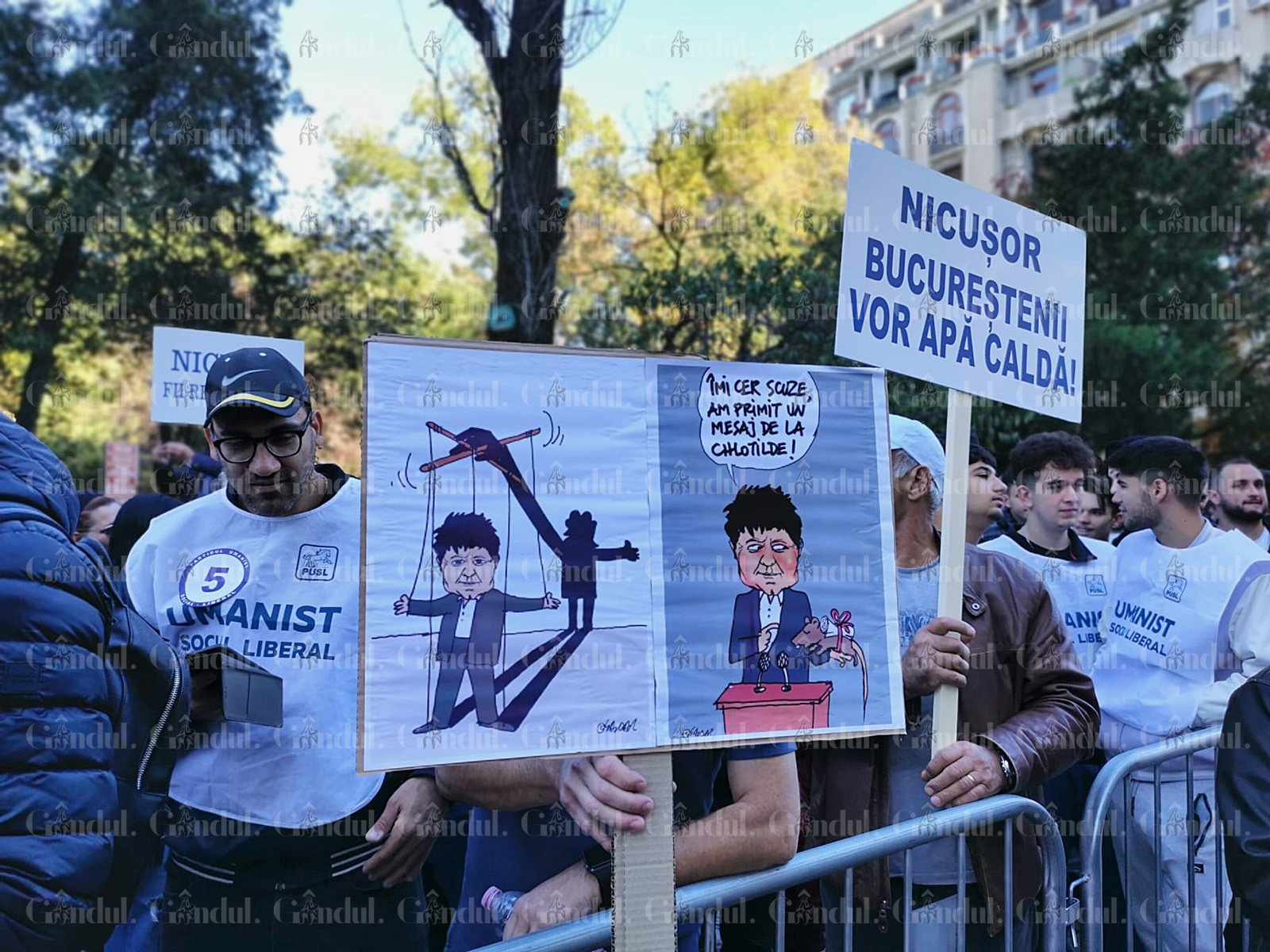 Protestatarii au venit cu zeci de pancarte, unele dintre ele cu desene, care îl arată pe Nicușor Dan în diferite ipostaze. De exemplu, într-o pancartă, primarul general este manipulat, cu sfori „din umbră”. Pe alte pancarte i se cere primarului să dea apă caldă bucureștenilor.
