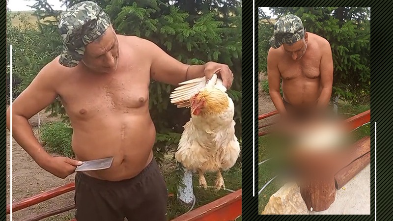 Imadiat după ce face glumele macabre, barbatul taie gâtul găinii dintr-o lovitură de satâr.