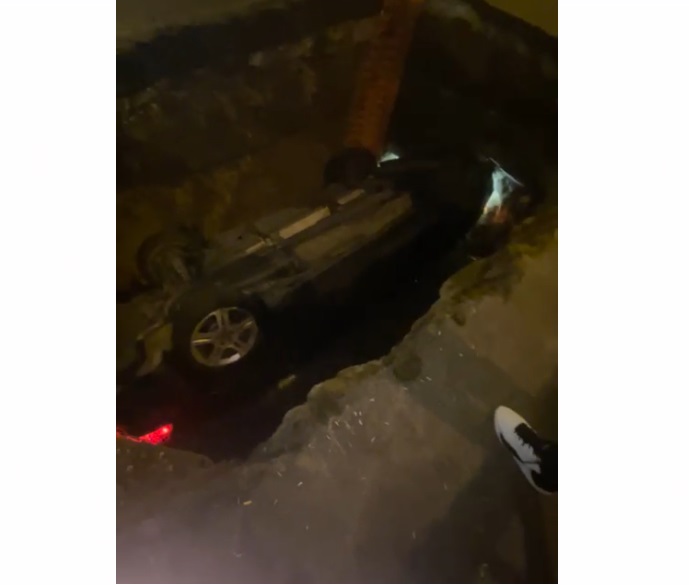Groapa era semnalizată corespunzător, pentru că în zonă se fac lucrări. Din cauza vitezei, însă, nu a reușit să evite accidentul. Așa că a căzut direct în groapă, iar plafonul mașinii a fost în jos.