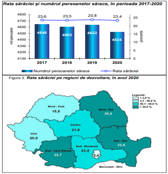 Sărăcia este inegal distribuită şi în profil regional. În anul 2020, rata sărăciei a fost de aproape 15 ori mai mare în regiunile Nord-Est ṣi de peste de 13 ori în Sud-Vest Oltenia ṣi Sud-Est, comparativ cu regiunea Bucureşti-Ilfov.