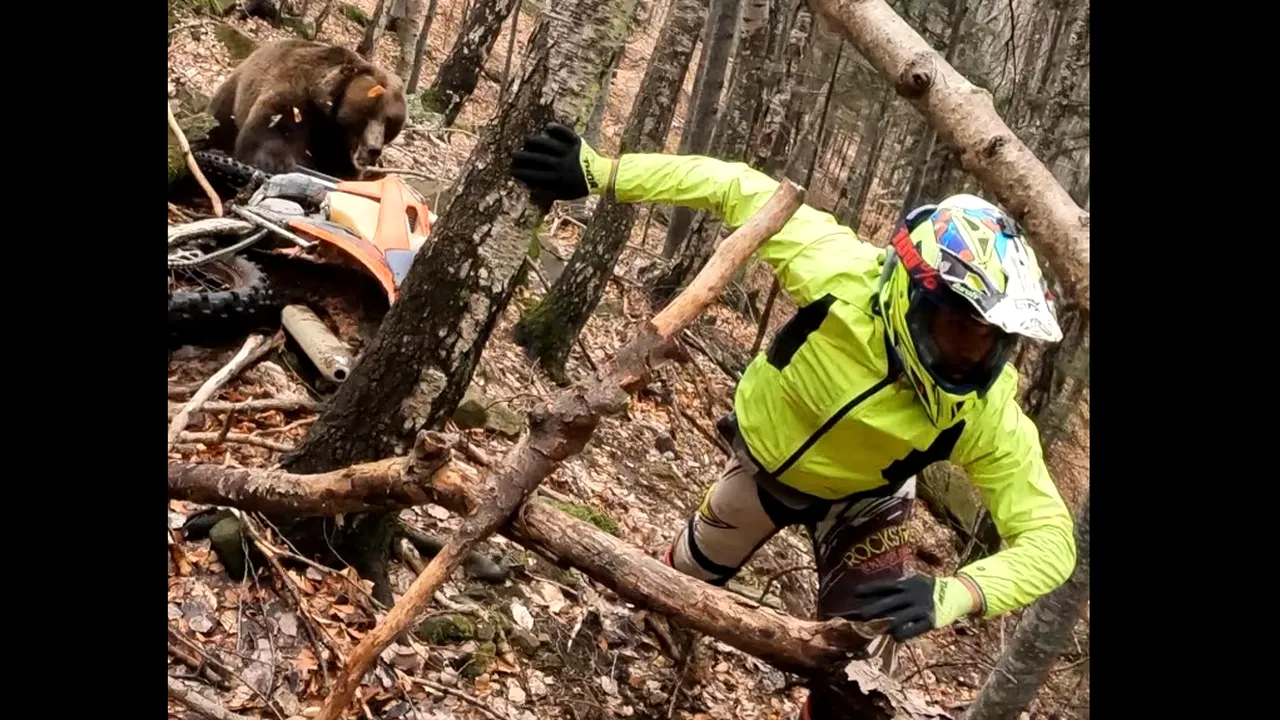 Alec Dumitrescu alias „Alec 131”, unul dintre cei mai buni piloți enduro români, a postat duminică seara pe pagina sa de Facebook o captură dintr-o înregistrare video cu o întâlnire de gradul zero. Astfel, din imagini rezultă că un pilot enduro a avut parte de un plus de adrenalină în timpul uneia dintre cursele organizate în pădure, după ce un urs ce părea deranjat din hibernare a atacat furios motocicleta.