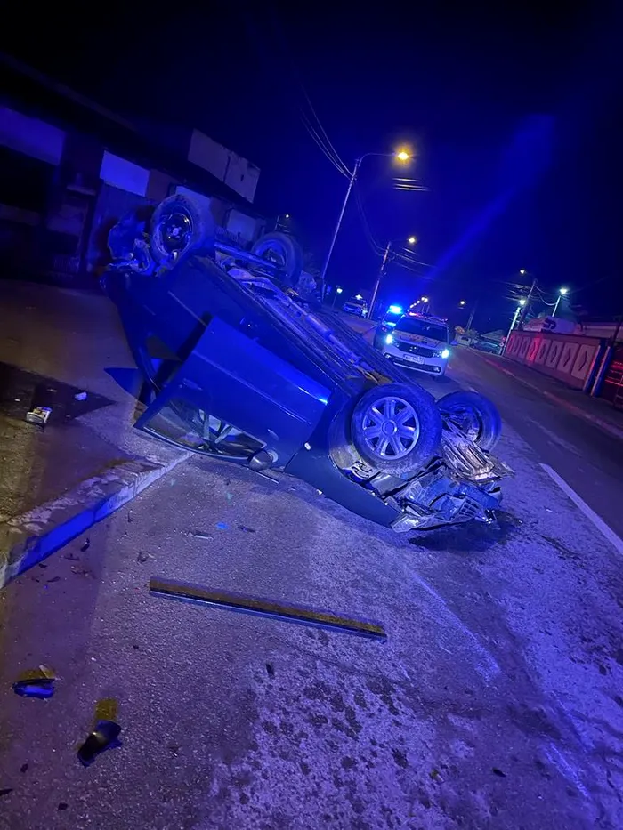 Pentru a-l opri, oamenii legii s-au luat după el cu autospeciala de poliție și, în timpul urmăririi, șoferul fugar a acroșat două autoturisme, parcate regulamentar, apoi s-a răsturnat.