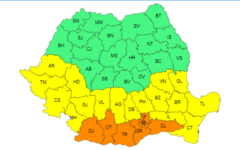 Joi, în Banat, nordul Olteniei și al Munteniei, precum și în sudul Moldovei valul de căldură va persista. Va fi caniculă, iar temperaturile maxime vor fi de 35…38 de grade. Disconfortul termic va fi accentuat, iar indicele temperatură-umezeală (ITU) va depăși pragul critic de 80 de unități.
