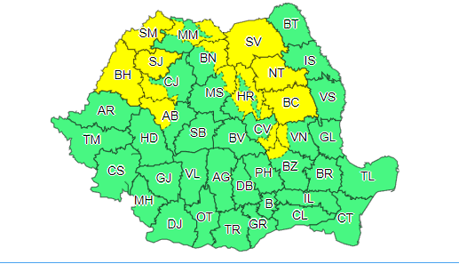 Vântul va prezenta intensificări și în nordul Crișanei, nord-vestul Transilvaniei și în dealurile subcarpatice ale Moldovei, în general cu viteze de 55…75 km/h.
