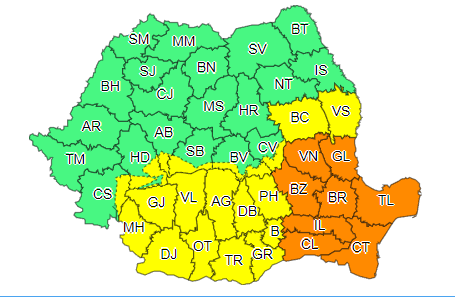 În intervalul 26 noiembrie, ora 02:00 – 26 noiembrie, ora 16:00 în județele Vrancea, Galați, Buzău, Brăila, Ialomița, Călărași, Tulcea și Constanța va ninge și va fi viscol. Vântul va avea intensificări susținute cu rafale de 75…85 km/h, iar vizibilitatea va scădea sub 50 m.