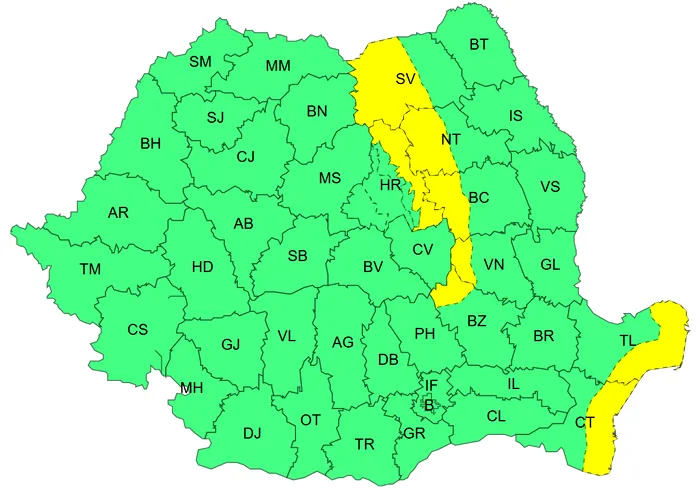 Totodată, este în vigoare și o atenționare cod galben de vânt pentru Carpații Orientali și zona litoralului, valabilă până în această seară la ora 22:00.